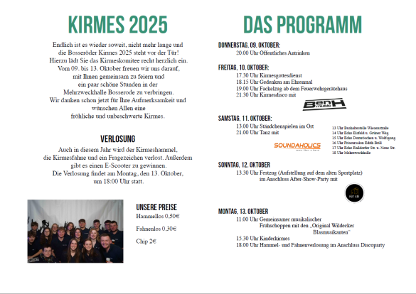 Unten finden Sie das diesjährige Programm der diesjährigen Kirmes, welche vom Kirmeskomitee Bosserode organisiert und ausgetragen wird. Sie beginnt am